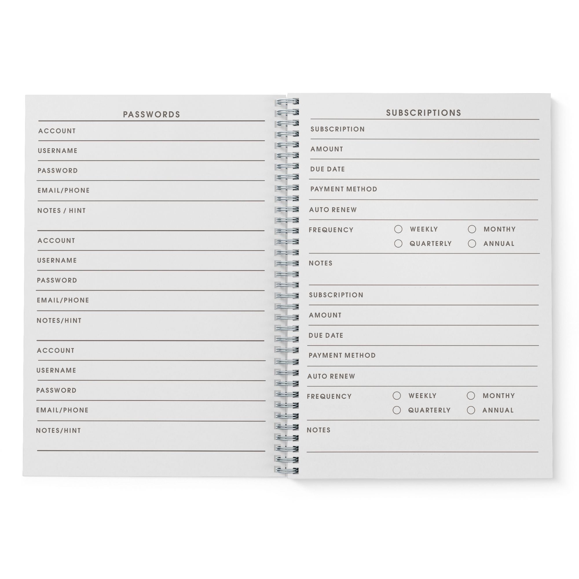 NEVER FORGET A PASSWORD / SUBSCRIPTION AGAIN - Our password & subscription journal will help you create secure passwords and keep them safe and organized. This journal allows you to store all your passwords and services subscribed to in one place to find it easily. Also record and track all your subscriptions and be in charge of your payments