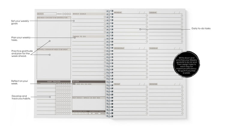 52 Weeks Undated Planner: Write down and prioritize your Weekly goals & to do list and then assign tasks to each day for maximum efficiency. No guilt if you miss a week.